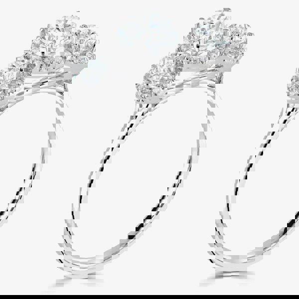 A stunning offering as a certificated round brilliant-cut diamond three stone halo engagement ring, this ring features a three centre stones, all of which are adorned by a diamond halo, hand set in a platinum claw setting, offering over 0. 63ct of diamond sparkle.