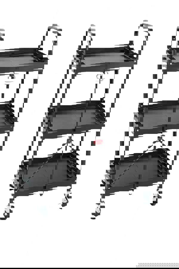 The folding frame allows compact storage when not in use, while the smooth surfaces are quick to clean with a damp cloth. Its easy-to-assemble structure makes setup hassle-free, ideal for both professional and personal use. Beyond tools and supplies, this cart can also serve as a restaurant trolley, mobile bar cart, book storage unit, or even a hair and makeup station.
