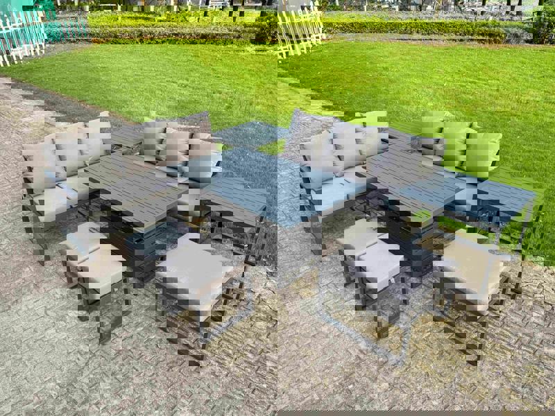 Rattan Garden Furniture Dining Set 8 seater Patio Height Adjustable Rising Lifting Table Sofa Set with 2 Big Footstool Dark Grey Mixed