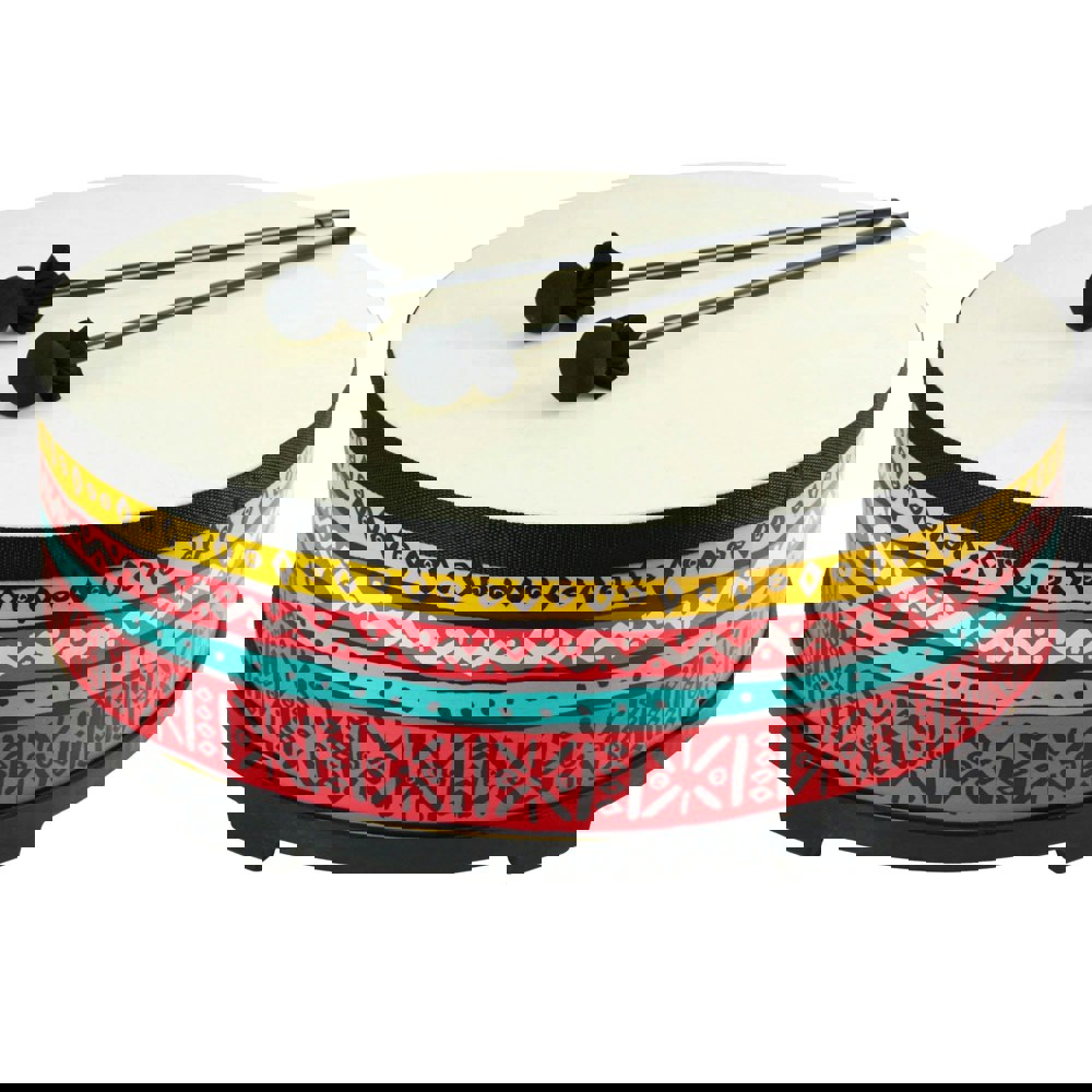 The drum is adorned with a vibrant, eye-catching pattern that captivates and draws in young learners, making it a fun and exciting addition to any music session. Its size ensures that it produces a deep, resonant sound that can fill a classroom, providing a satisfying auditory feedback to budding musicians.