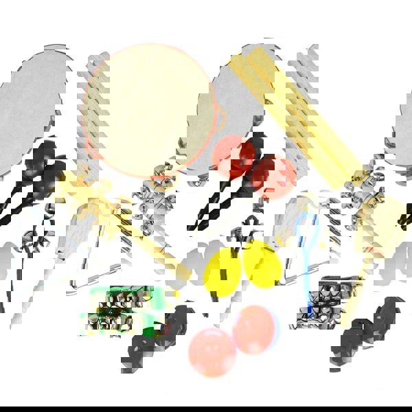 With a handy plastic storage bag with zip, you can keep all of the instruments together, safe and protected. This particular set includes a tambourine, maracas, egg shakers, claves, triangle and more. Not suitable for children under 3 years.