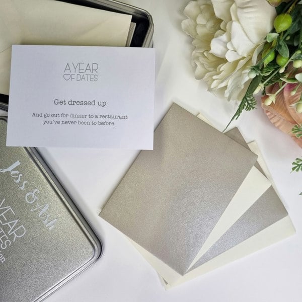 What they will find: 12 sealed silver and cream envelopes, each containing a date idea. The activities are designed to be achievable for any couple. This gift suits any wedding anniversary, and because it is presented in a tin, it is ideal for a tin anniversary.