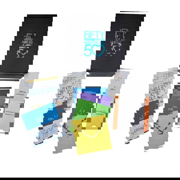 A small box with a big impact. Suitable for any gender, this stylish black gift box holds 50 thoughtful surprises to celebrate the recipients 50th birthday.