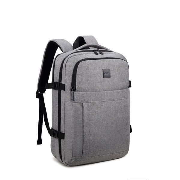 It offers a front quick-access pocket, USB charging port, deep front main pocket with slots for receipts, pens, and accessories, main body section with zipped access, clothing retention straps, and separate zip pocket, rear zipped section for added versatility, padded adjustable shoulder straps, padded back panel for airflow, top and side carrying handles, four side compression clips, and a luggage strap for easy suitcase attachment