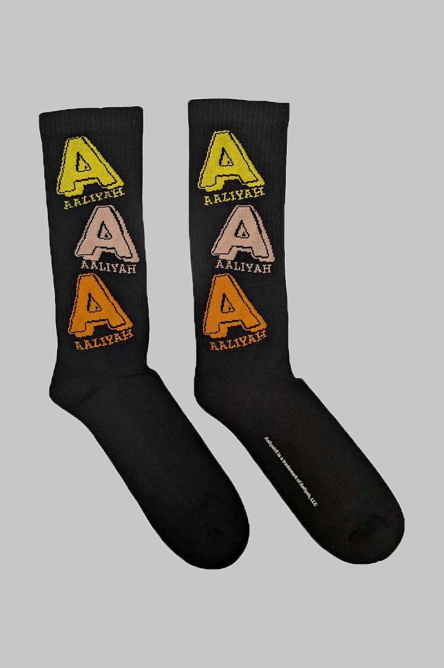 Official licensed Aaliyah Unisex Ankle Socks featuring the 'Tricolour Logo' design motif. These high quality Ankle Socks are available in a black colourway. These premium quality, colourful, all-over pattern cotton rich woven socks are guaranteed to stand out in the crowd. They are a thicker quality cotton similar to sports quality terrycloth.