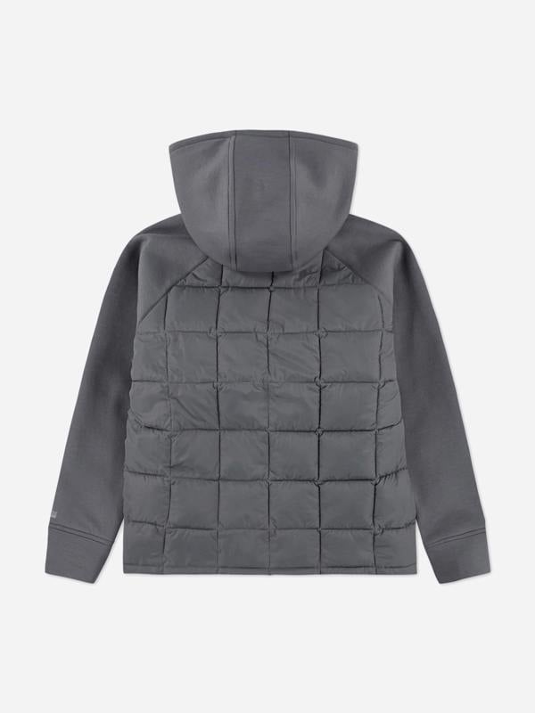 Cosy-lined zip pockets provide secure storage, and the hybrid build combines multiple materials across the body, lining, sleeves and hood. Finished in grey, this piece balances everyday function with a refined outerwear profile.