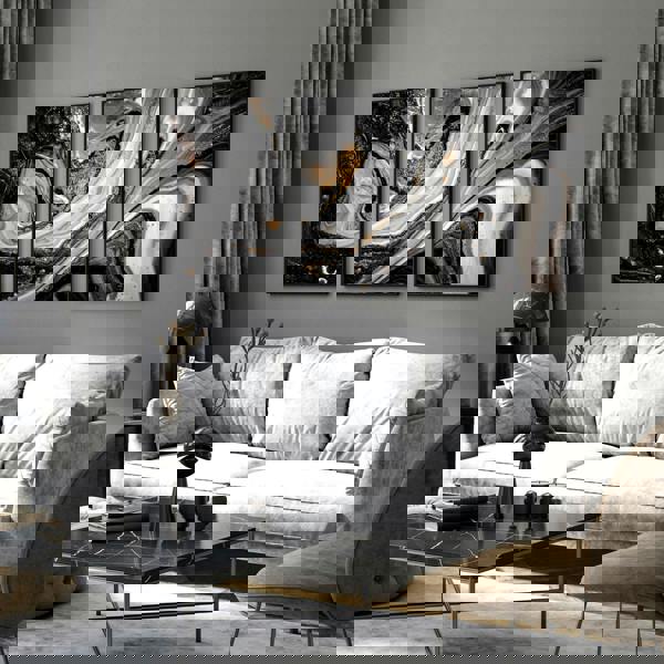 Additionally, Each print showcases a unique and abstract design in a striking combination of black and gold. The rich and luxurious colour palette, and intricate details of the marble texture will become a focal point in your living room.