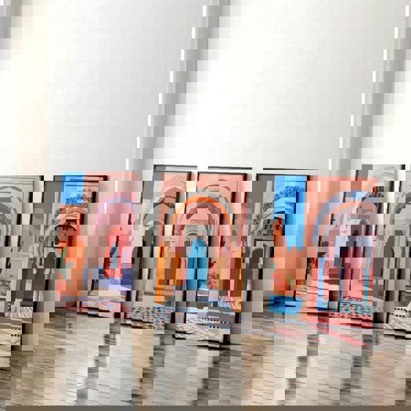The unique designs and vibrant colours of these prints not only draw the eye but also create a rich tapestry of cultural inspiration. Furthermore, the pink wall art palette adds a gentle sophistication, elegantly balancing the traditional Moroccan style with a modern twist. Your guests won't be able to resist admiring the stunning combination of art and tradition that sets your living room apart.