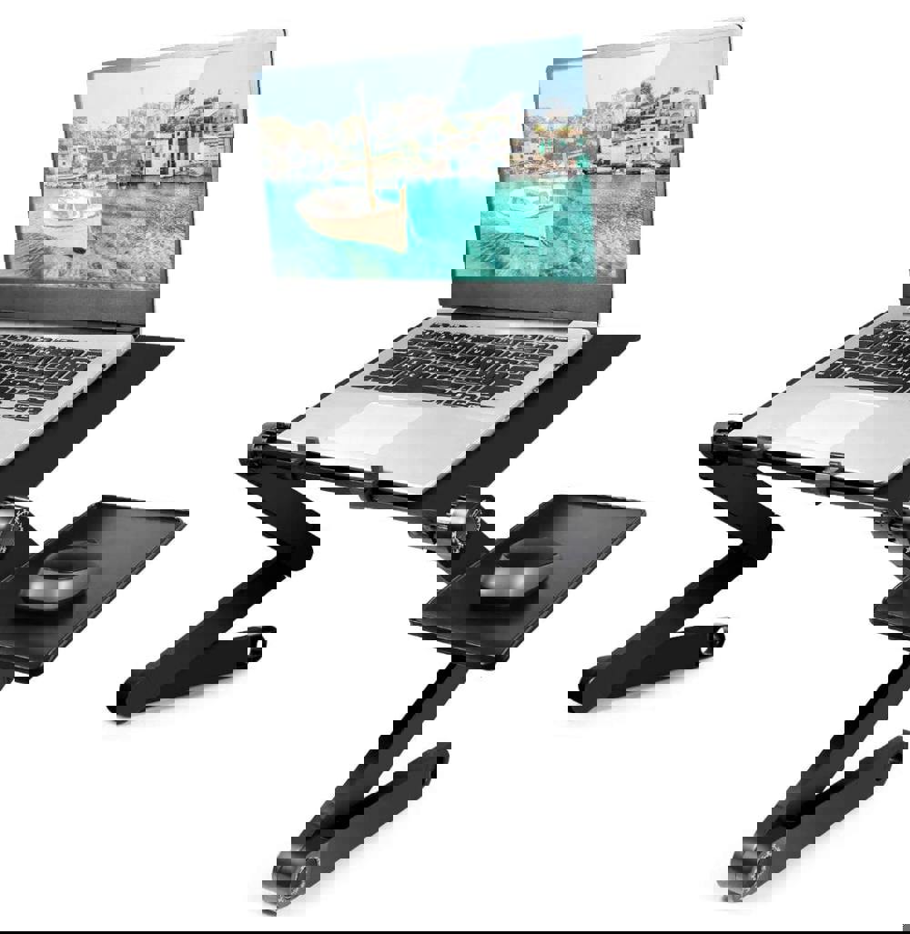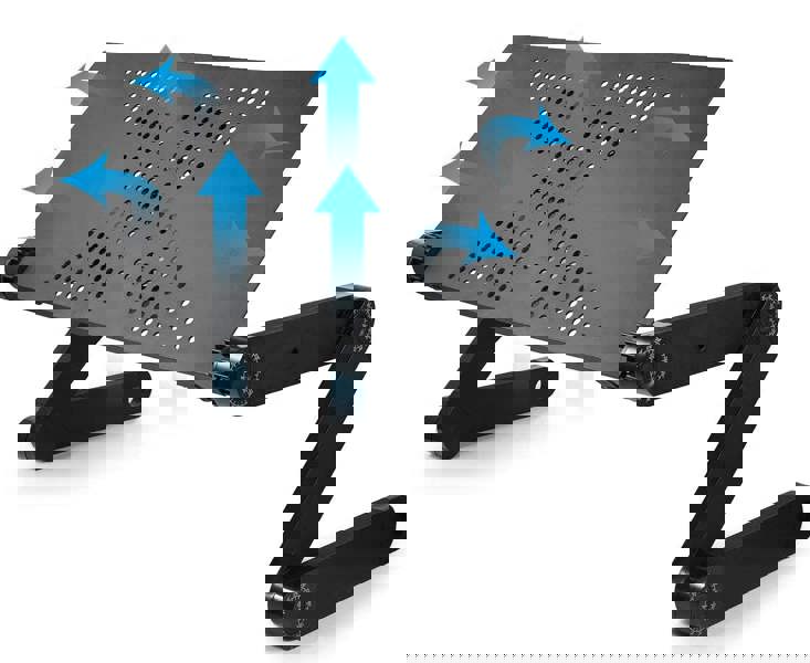 A lightweight, high-strength aluminium tray is paired with integrated non-slip feet for stable placement on tabletops and desks. Rear stoppers can be affixed to the main tray to help prevent a laptop slipping off the back edge, while an attachable mouse tray fixes neatly to the side. For extended sessions, a large integrated silent cooling fan supports airflow around your device.