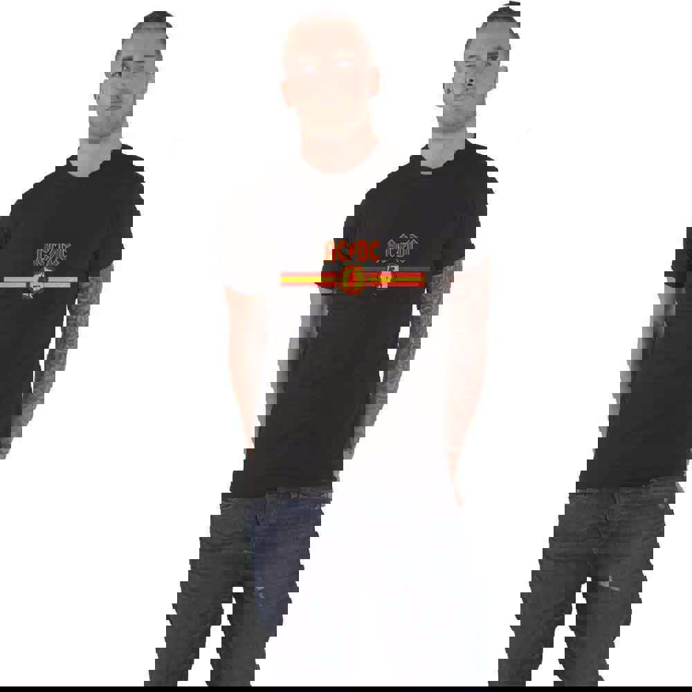 An official licensed soft-style cotton tee featuring the AC/DC 'Logo & Stripe' design motif. This high quality t-shirt is available in a black colourway. Comes in a wide range of sizes from Small through XX-Large, subject to availability.
