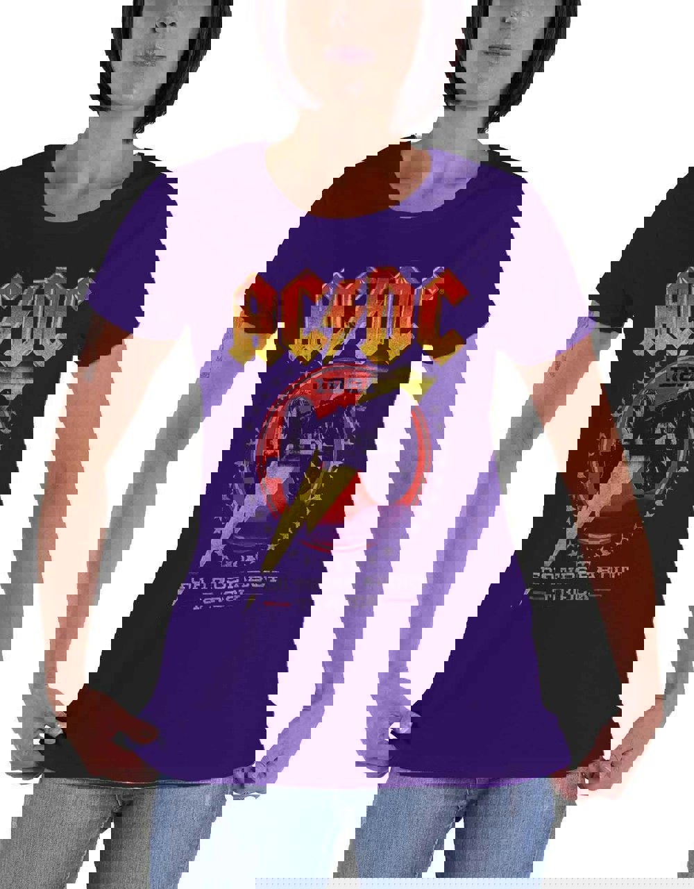 An official licensed AC/DC Ladies Tee featuring the 'For Those About To Rock '81' design motif. This high quality Tee is available in a purple colourway. Comes in a wide range of sizes from X-Small through X-Large, subject to availability.