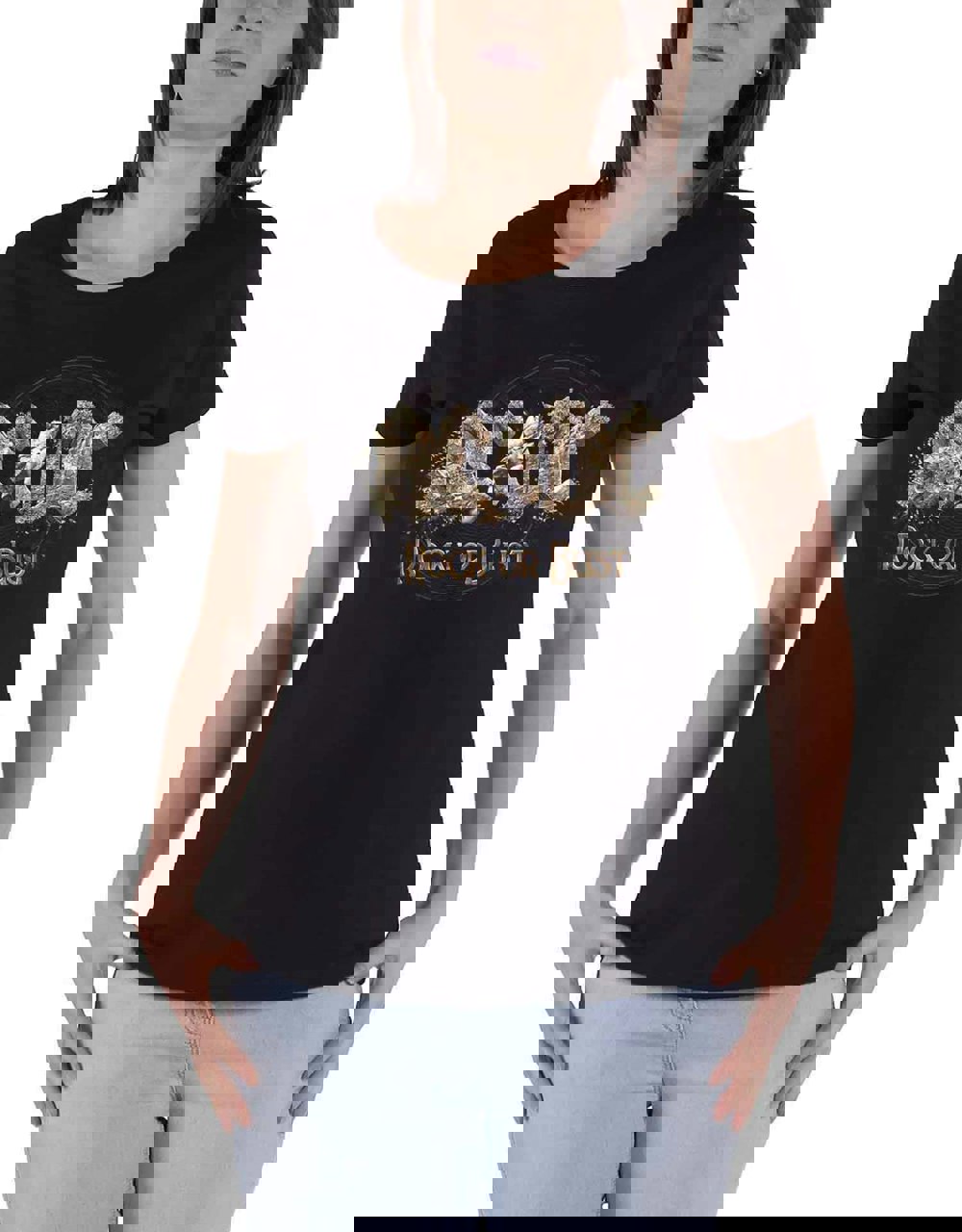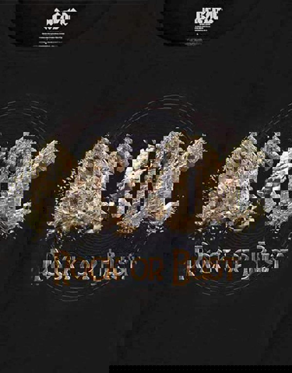 New and official band merchandise AC/DC women's skinny fit T shirt Tee showing the Rock or Bust graphic design on a 100% cotton. This high-quality t-shirt is available in a black colourway. Size options include Small through XX-Large.