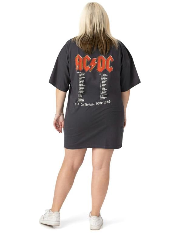 The charcoal grey dress features the band's logo and the Fly on the Wall Tour 1985 print across the front to the back, making it the ultimate fashion statement for any concert, festival, or tour