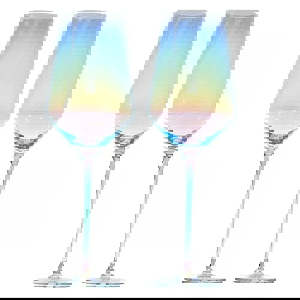 Raise a glass in sparkling style with our exquisite set of 2 Rainbow Wine Glasses. These trendy glasses feature a mesmerizing pearlescent look that truly steals the show. As they catch the light, they shimmer in a captivating array of rainbow colors, creating a delightful visual spectacle.