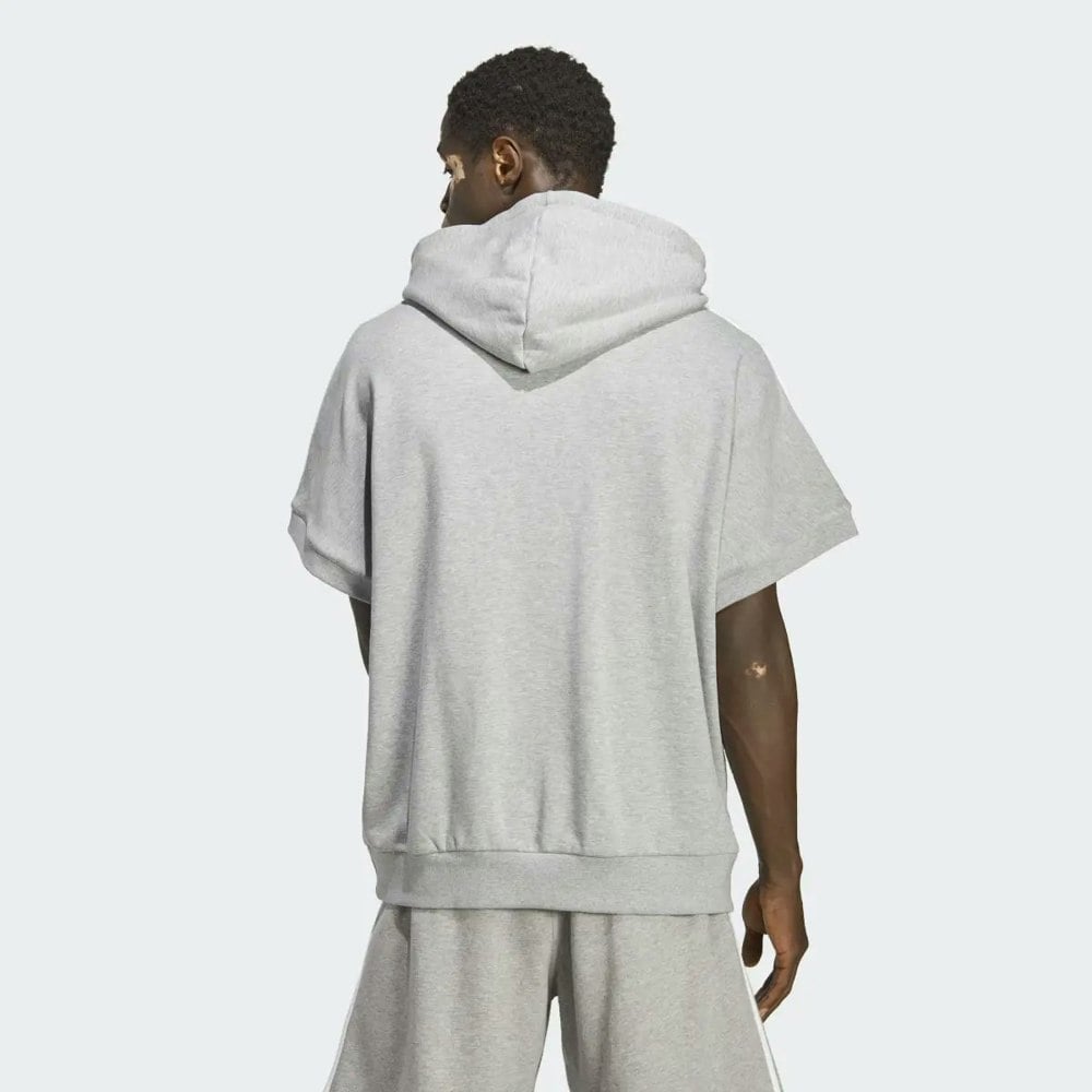 The grey Adidas Adicolour Classics short sleeve hoodie, with ribbed cuffs and hem. Perfect for those seeking both comfort and style.
