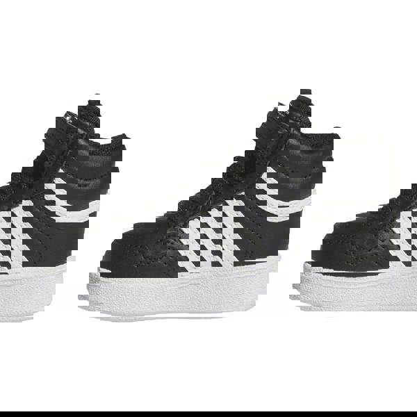 Adidas Baby Hoops 4.0 trainers come in a mid cut shape with a plain black finish and contrast detailing. A round toe and rubberised cupsole construction complete the profile, with a rubber outsole for everyday wear.