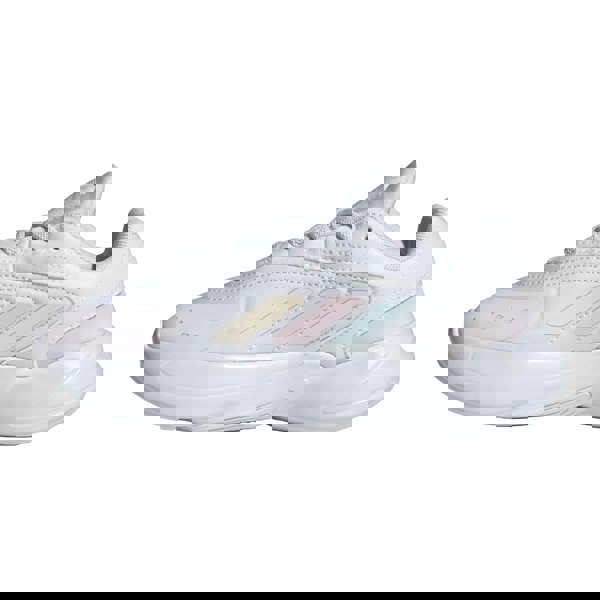 These adidas children’s Ozelia trainers come in Cloud White with Almost Pink and Almost Blue accents. The upper combines heat welded panels with textile, finished with a plain base, contrast stripe and logo detailing. A round toe and low-cut profile keep the shape clean and simple, while the low heel maintains a streamlined silhouette.