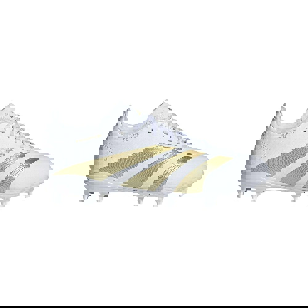 These adidas children’s Predator League firm ground boots come in white with a low-cut profile and a round toe. The upper uses a hybrid synthetic construction, paired with a textile lining and a synthetic midsole. A synthetic outsole completes the build for use on firm ground.