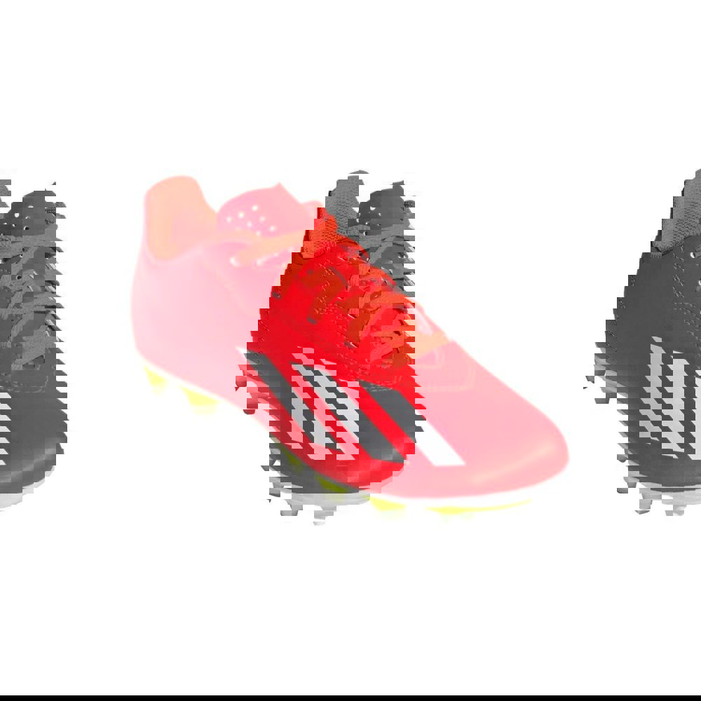 These adidas children’s X Crazyfast Club flexible ground football boots come in red with a low-cut profile and a round toe. The soft, textured synthetic upper is paired with a synthetic and textile lining, while a flexible synthetic outsole supports movement on flexible ground surfaces. A lace-up fastening runs through five eyelets for a secure fit, finished with a flat heel.