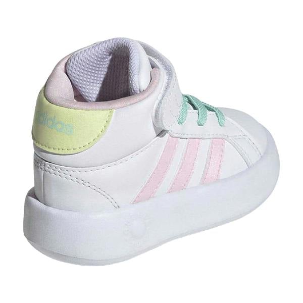 These adidas kids Grand Court trainers come in a mid cut shape with a colour block design and logo detailing. The upper is made from synthetic leather, with a textile lining for a clean internal finish. A round toe keeps the profile classic, while the flat construction suits everyday wear.