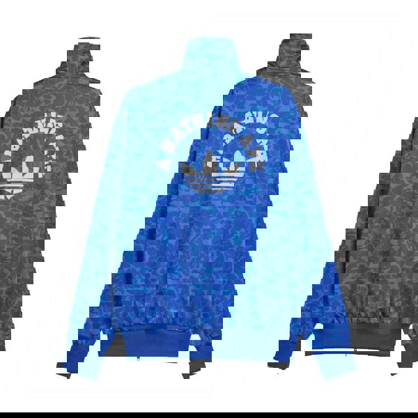 This adidas men’s track top is made from 100% recycled polyester and comes in blue with an all-over patterned print. A standing collar and long sleeves create a classic track silhouette, while contrast stripe detailing adds definition to the look.