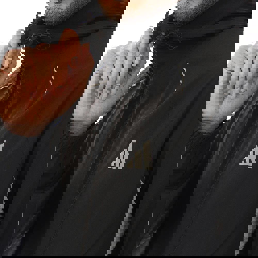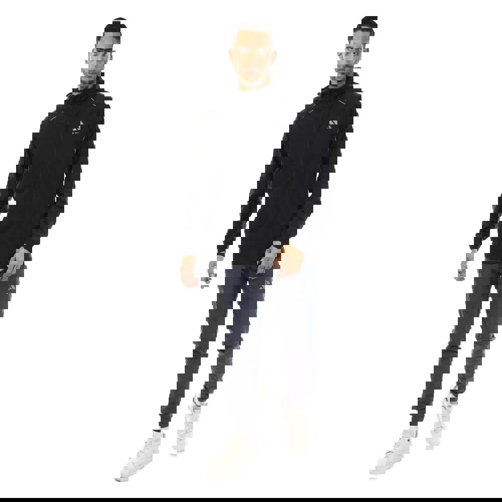 A hooded neckline and long sleeves create a classic track-jacket profile, while elasticated cuffs keep the shape neat. Climacool fabric technology and a breathable construction are paired with a full zip fastening. Two side pockets with zip closure provide secure storage for small essentials.
