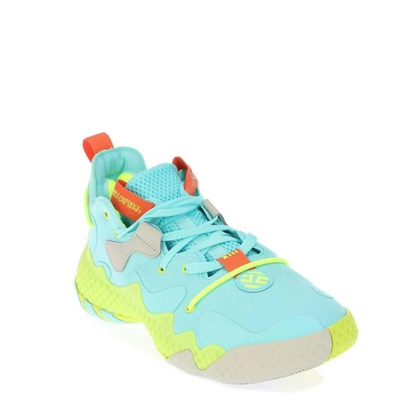 These adidas Harden Vol. 6 trainers are built with a high-top cut and a flat profile, finished in a blue, green and orange colour palette. The upper combines textile with webbing, while contrast stripes and a logo add a bold, sport-led look suited to basketball.