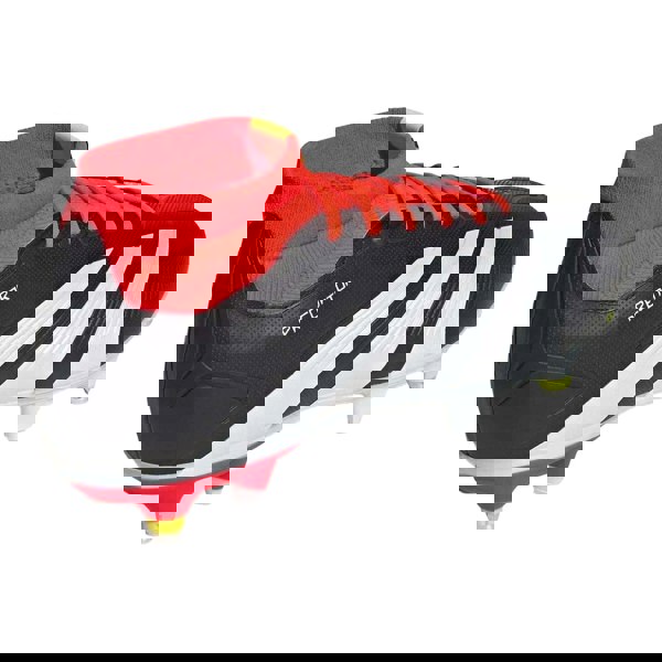 Finished in black and white, this pair features contrast detailing alongside printed elements, text and a logo for a bold, modern look. The round toe shape provides a classic football-boot silhouette, and the gripped synthetic outsole is paired with removable studs to suit your setup and playing surface.