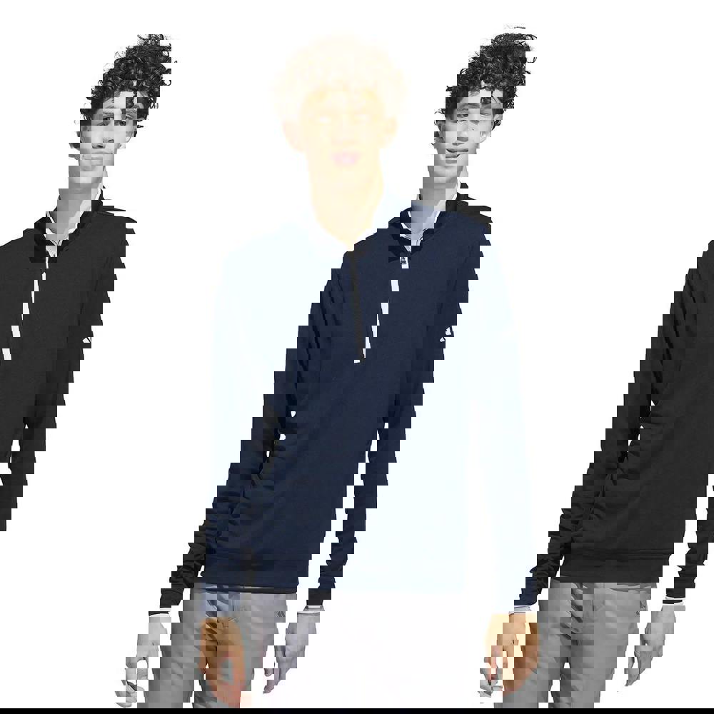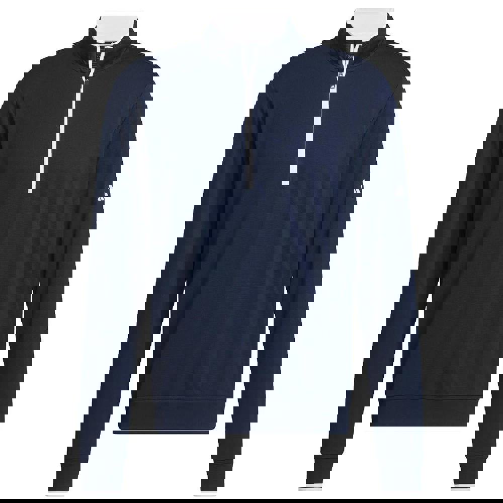 Ribbed cuffs and a ribbed hem add structure, while the pull over style is paired with a quarter zip fastening for easy wear.
