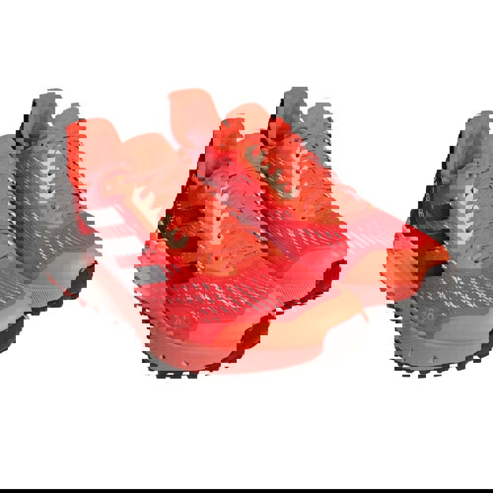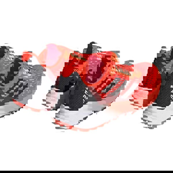 Built for trail running, these adidas Terrex Agravic Flow 2.0 shoes combine a low-cut profile with a regular fit and a flat sole. The upper uses mesh with plastic and recycled polyester, keeping the look lightweight while maintaining a structured feel. Orange and black styling is finished with bark textures, a contrast stripe and logo detailing.