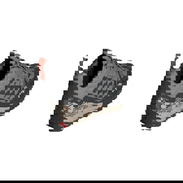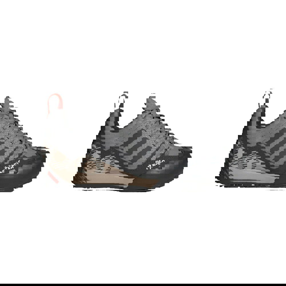 Adidas Terrex Swift Solo 2.0 hiking shoes in grey with a low-cut profile and flat sole. The upper uses recycled materials in a ripstop construction, finished with a synthetic overlay for added durability in high-abrasion areas. A textile lining and synthetic insole complete the interior, while the EVA (ethyl vinyl acetate) midsole provides lightweight cushioning underfoot.