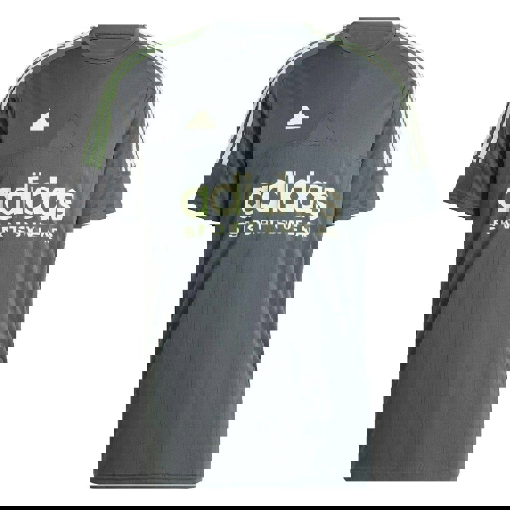 This adidas Tiro T-shirt is made from 100% recycled polyester in a double knit jersey fabric. It has a plain base with logo branding and stripe detail for a clean, sporty look.