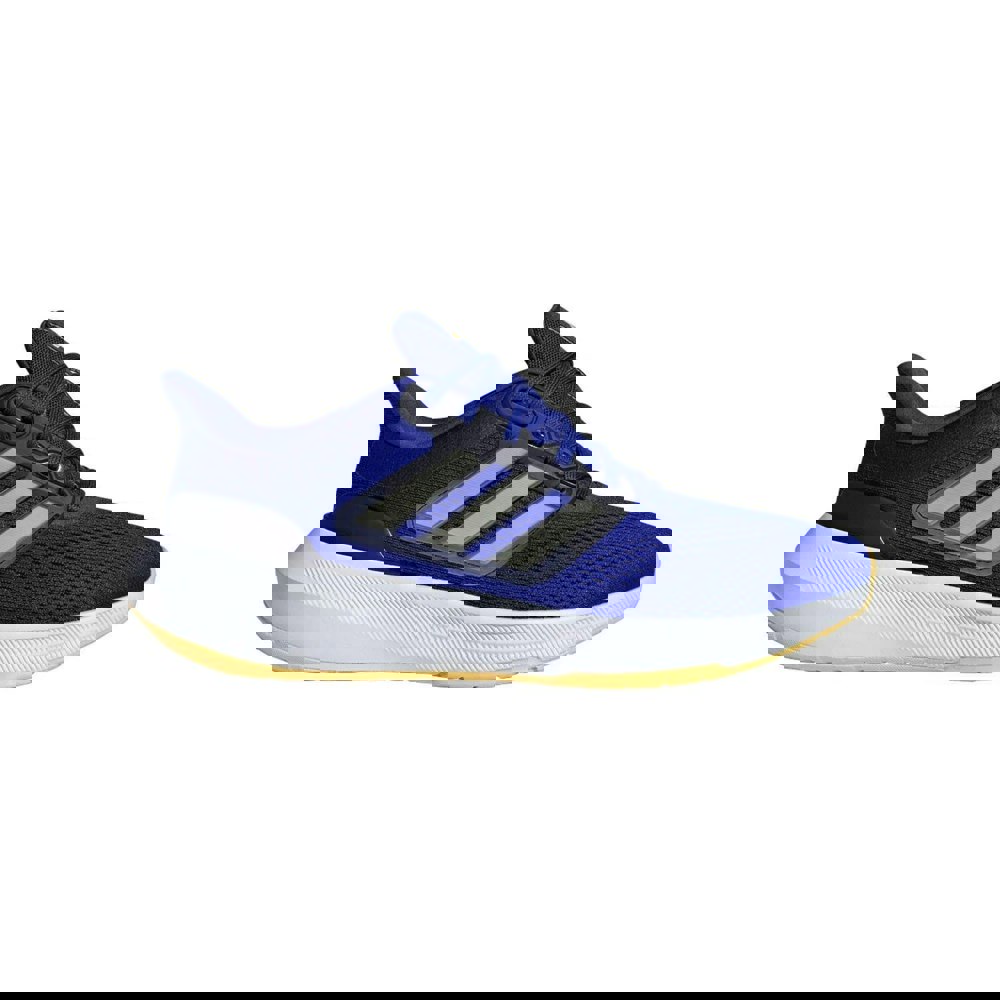 Adidas Ultrabounce running shoes in Lucid Blue/Grey/Spark with a low-cut profile and round toe. The upper combines recycled materials with textile, paired with a textile lining and a synthetic insole. A Bounce midsole sits underfoot, with a rubber outsole for the base.
