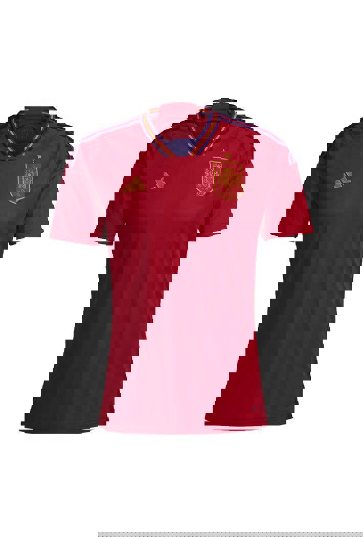 Designed for the Qatar World Cup, the 2022 Spain home shirt puts a darker twist on the traditional colours. The classic red base is accented with bold navy detailing on the shoulders, collar and cuffs, while the national crest and adidas logo are printed in the usual yellow. “Unidos por un pais” (United by a country) lettering just below the back collar completes a look dripping with national pride. The redesigned Spain badge is making its debut appearance on this kit with a sleek, monochrome look, and the classic Three Stripes have also been streamlined, with the removal of the “adidas” lettering. A single gold star crowns the national crest, celebrating Spain’s previous success at the 2010 World Cup. Mesh panels in high-heat areas promote airflow, while moisture-absorbing AEROREADY technology wicks sweat away from your skin to ensure that you stay cool, dry and comfortable through tough training sessions and the nervy final minutes of World Cup knockout games. Made from 100% recycled polyester, this shirt is perfect for the environmentally conscious Spain supporter looking to make a difference.