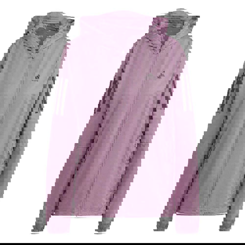 This hooded running jacket is made from 100% recycled polyester and finished in pink with a logo, reflective detail and a side stripe. Wind resistant fabric technology and a high collar create a streamlined outer layer for active wear.