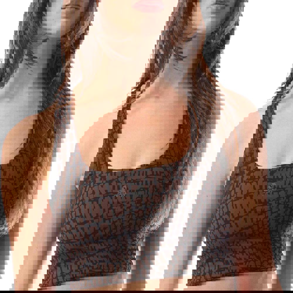 The design includes a logo and patterned finish, with a scoop neckline. An adjustable strap allows for a personalised feel, while removable padding offers flexible coverage.