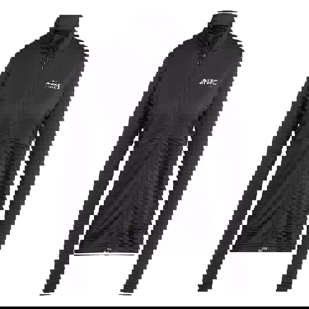 Adidas Women’s Terrex Multi lightweight full zip fleece jacket in black is made from 95% recycled polyester and 5% elastane. The brushed fleece honeycomb fabric is breathable, lightweight and moisture wicking, with a streamlined fit for a clean, close profile.