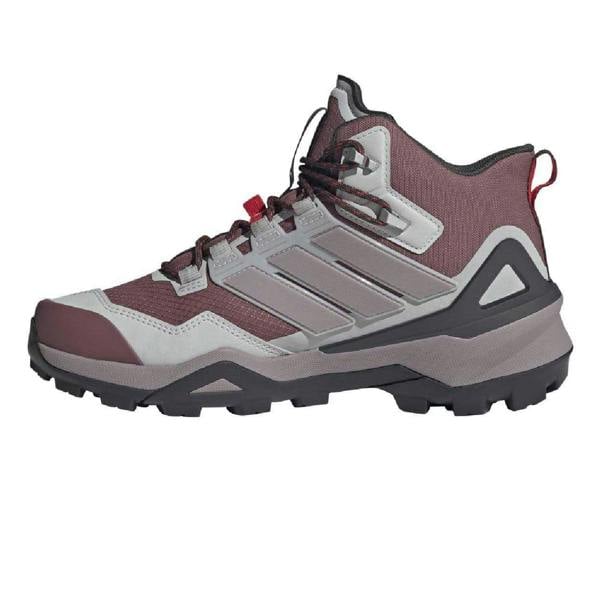 Adidas Terrex Skychaser GORE-TEX hiking shoes in red with a low-cut profile and printed design. The upper combines moulded overlays with ripstop, synthetic, and textile materials, finished with a round toe and moulded toe cap. A lace-up fastening and regular fit keep the shape secure for walking and outdoor use.