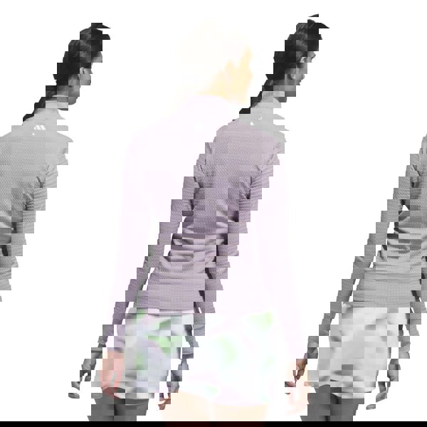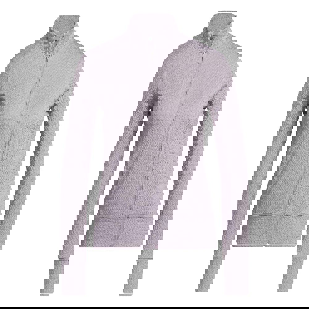 Adidas Womens Ultimate365 Textured Jacket in purple is made from 96% recycled polyester and 4% elastane. The stretch waffle fabric has a textured finish and includes knit panels for added structure. A standing collar and long sleeves create a clean, sporty profile, while princess seams shape the silhouette.