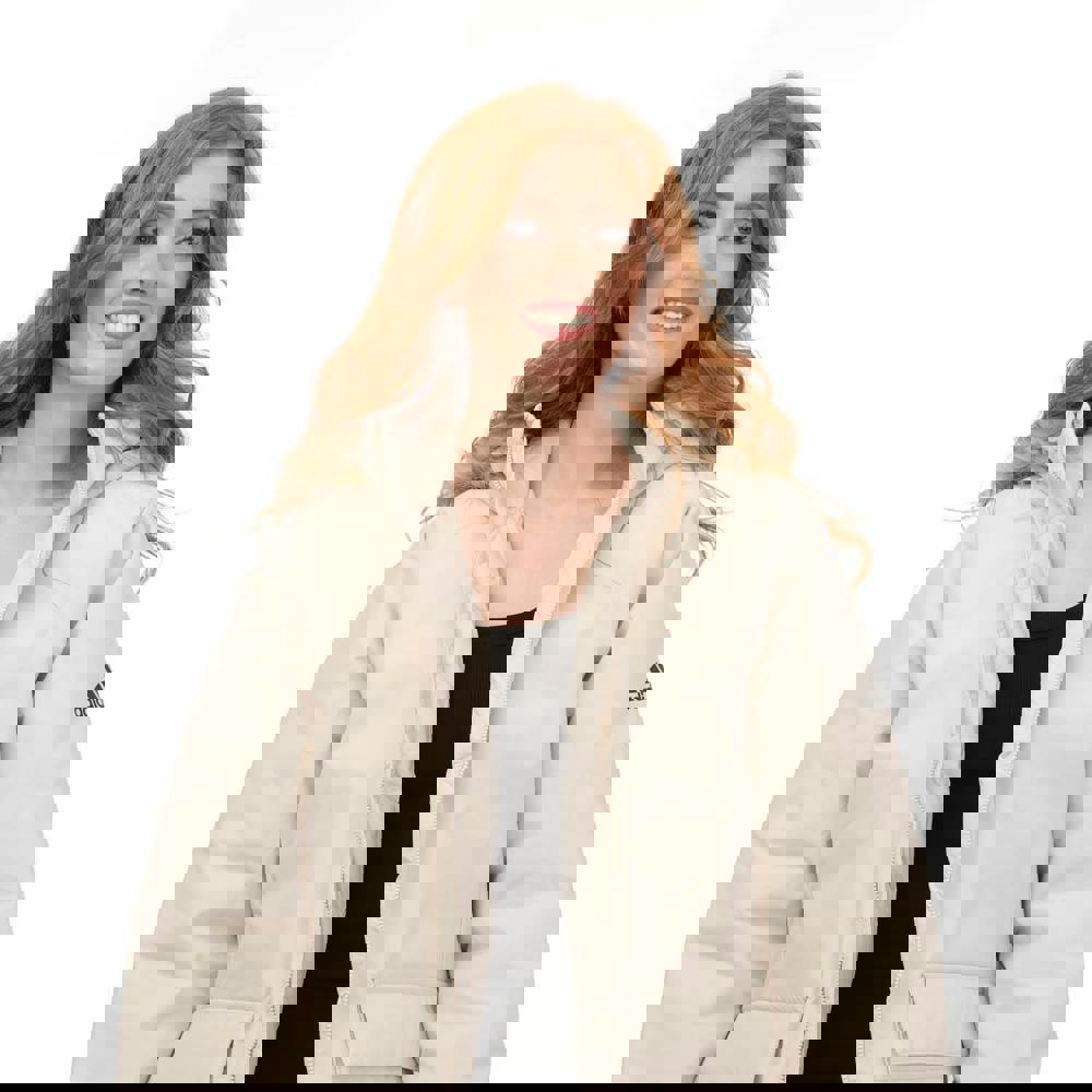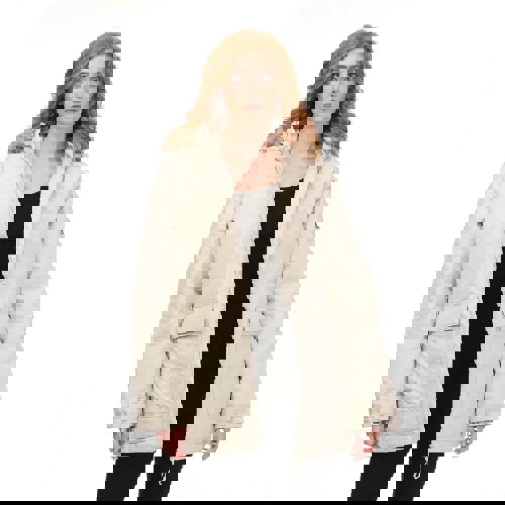 The hood includes a detachable faux fur trim secured with snap fastenings. A full zip fastening runs through the front, while the cuffs adjust with hook and loop straps. Storage is provided by two front pockets with double entry, finished with buttoned flap closures.