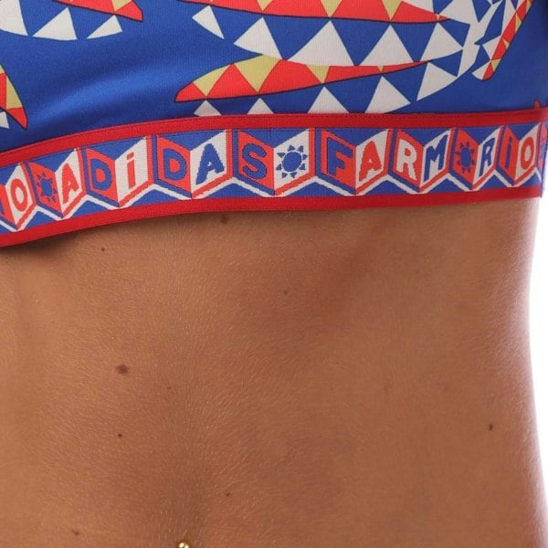 This medium support sports bra is made from 85% recycled polyester and 15% elastane. It has a printed design with text and uses Aeroready fabric technology. The tight fit and pull over fastening create a close, streamlined feel, while the scoop neckline keeps the shape simple and sporty.
