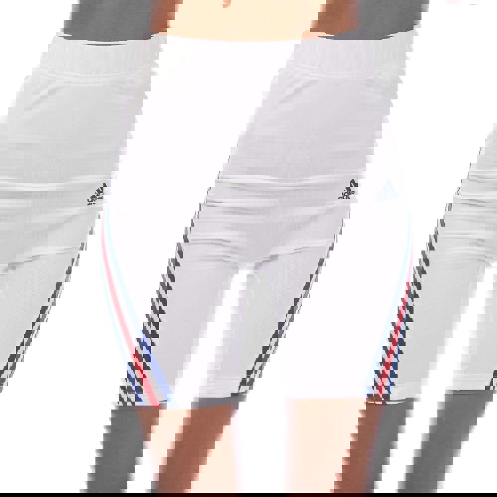 These adidas womens Future Icons biker shorts are made from 90% cotton and 10% elastane, with a soft-touch feel and added stretch. The design combines contrast stripes with a logo detail, finished in a white, red and blue colour palette.