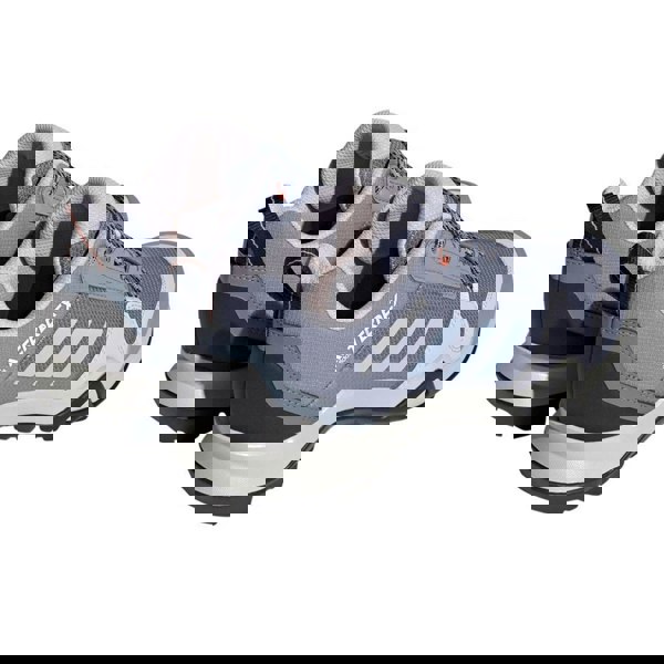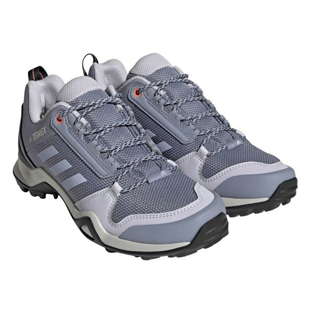 These adidas Terrex AX3 hiking shoes come in violet and silver with a low-cut profile and a round toe. The upper combines mesh and synthetic materials, paired with a textile lining and a synthetic insole. A moulded sock liner and pull tab add practical detail, while the flat sole construction keeps the silhouette clean.