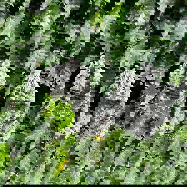 Meanwhile, the baby mammoth on the right lies down, gazing forward with a calm expression. The contrast between their grey stone texture and the vibrant green ivy leaves creates an eye-catching display.