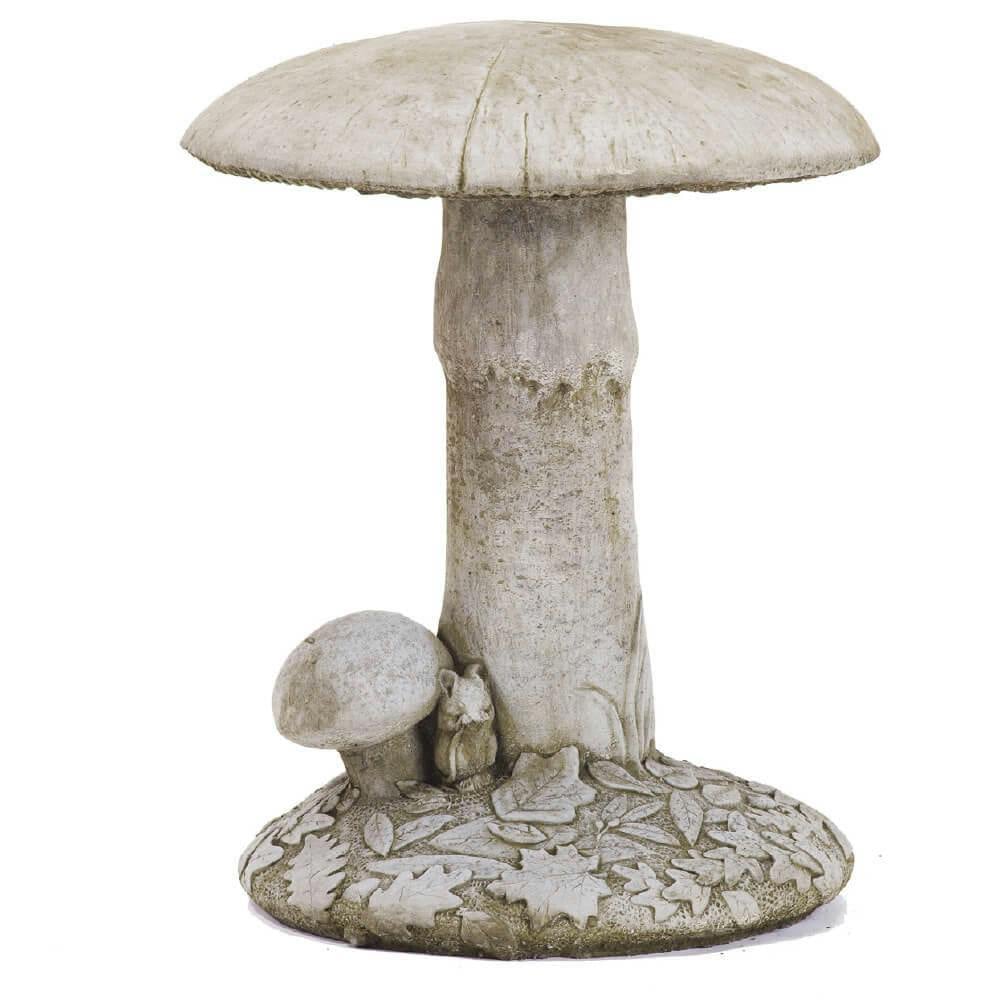 A charming large mushroom statues made from stonecast material, complete with a cute squirrel underneath it. The realistic shape of the mushroom make it an eye- catching addition to any garden or outdoor space.