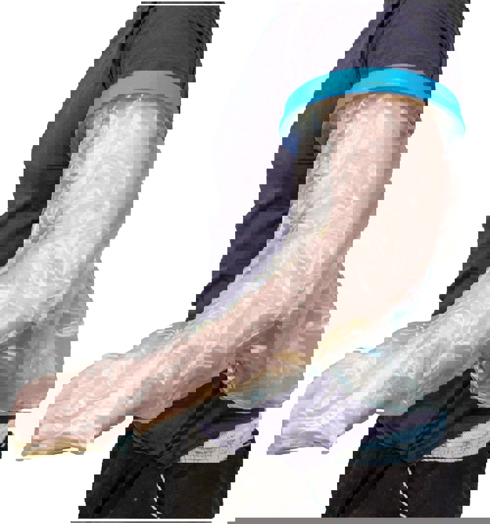 The waterproof protectors are easy to use by simply pushing your hand or foot through the hole in the top and using the green plastic cuff to pull the sleeve over the area you wish to keep dry.
