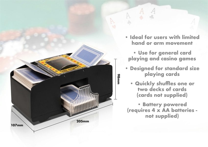 The Card Shuffler is designed for use with one or two packs of standard playing cards not supplied and is ideal for general card playing including bridge or casino games such as poker, as well as being a great product for those with limited use of their hands due to arthritis or other conditions.