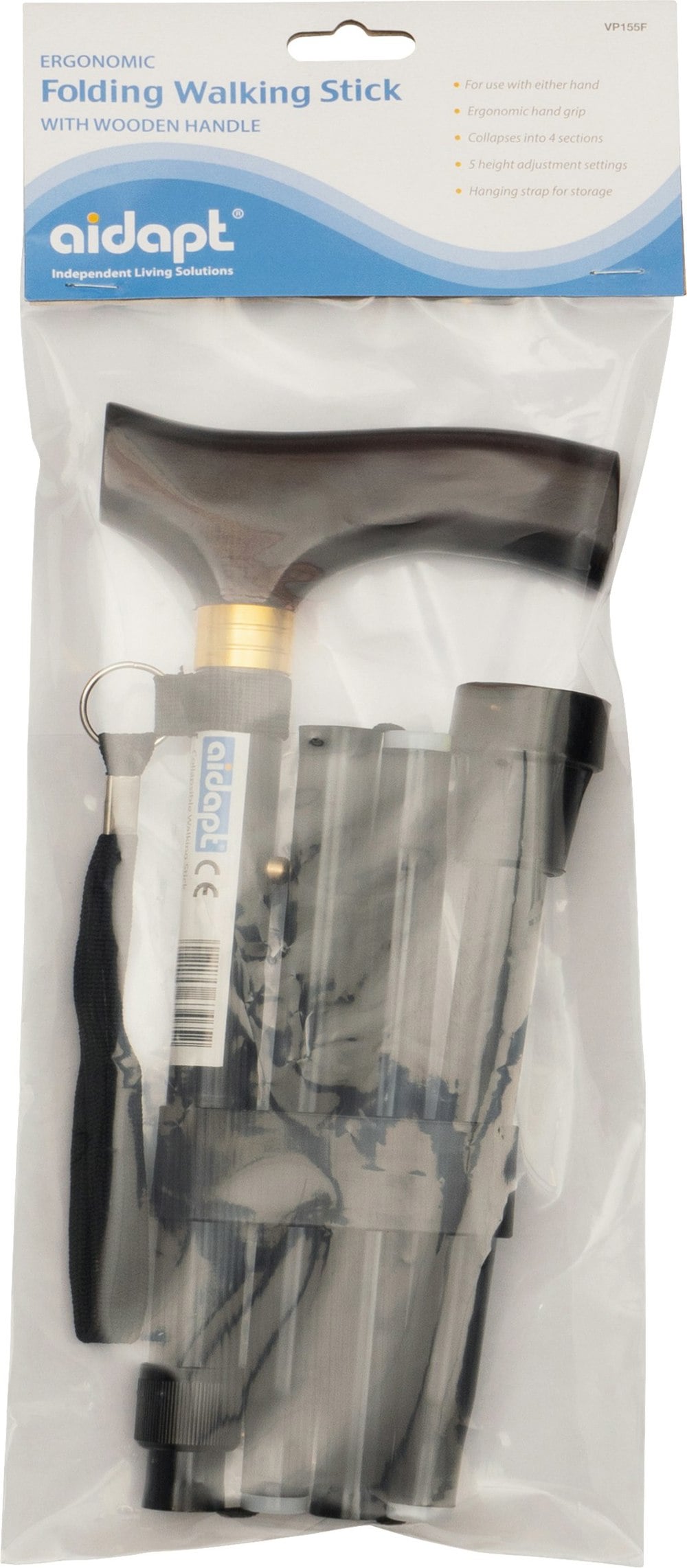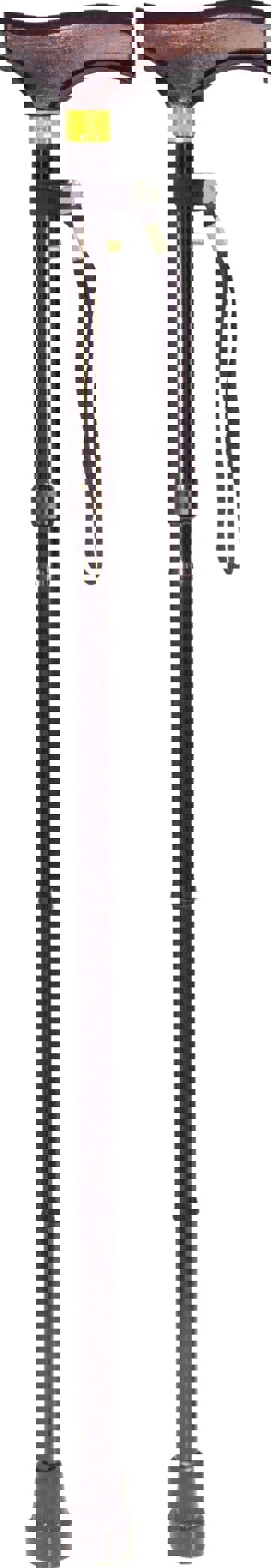 A height adjustable 5 settings Walking Stick, for use with either hand, features a durable, comfortable grip wooden handle.