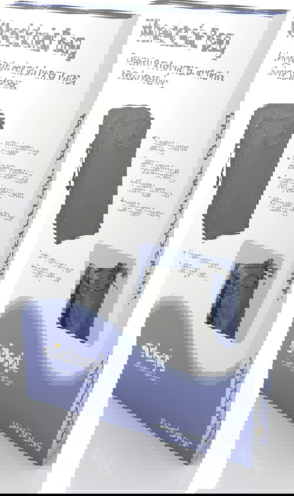 The Wheelchair Bag has been specially designed to fit neatly onto the rear of most standard wheelchairs with pram handles and provides a generous, zipped storage space for coats or jackets, shopping, medication, snacks, etc.