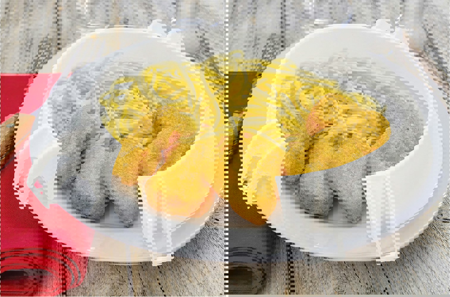 The edge of the plate guard is curved to help keep food on the plate.